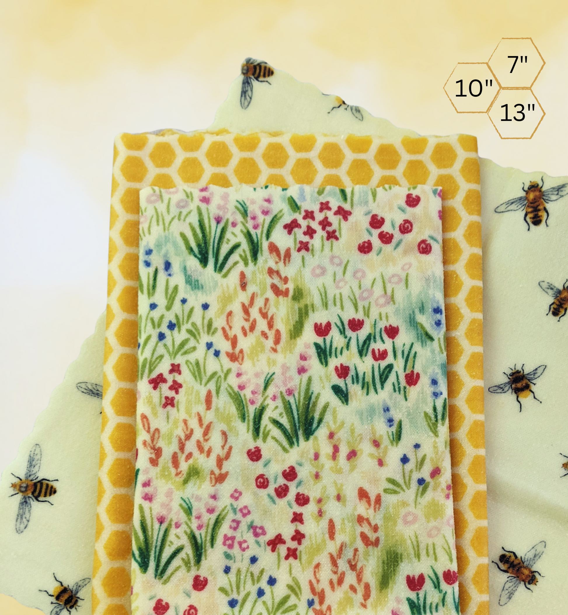 Beeswax Food Wrap pack of 3. Our reusable beeswax food wrap  is compostable. sustainable, and plastic- free! Each beeswax cloth is made with 100% washed cotton, Canadian beeswax, organic jojoba oil and natural tree resin.