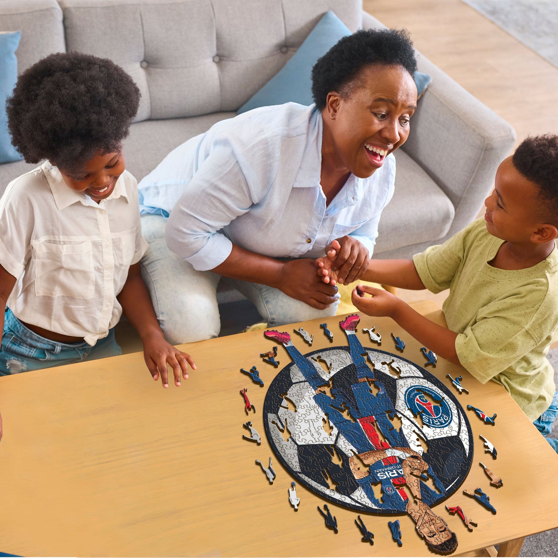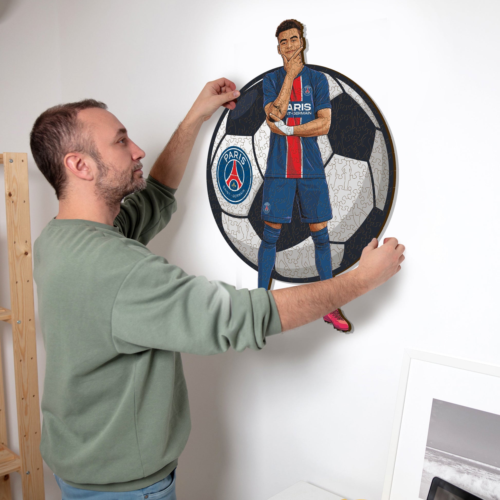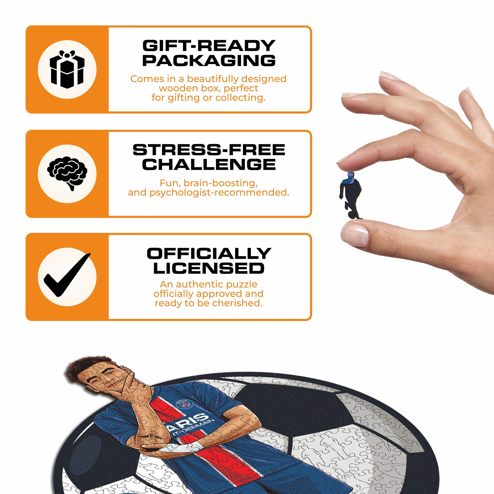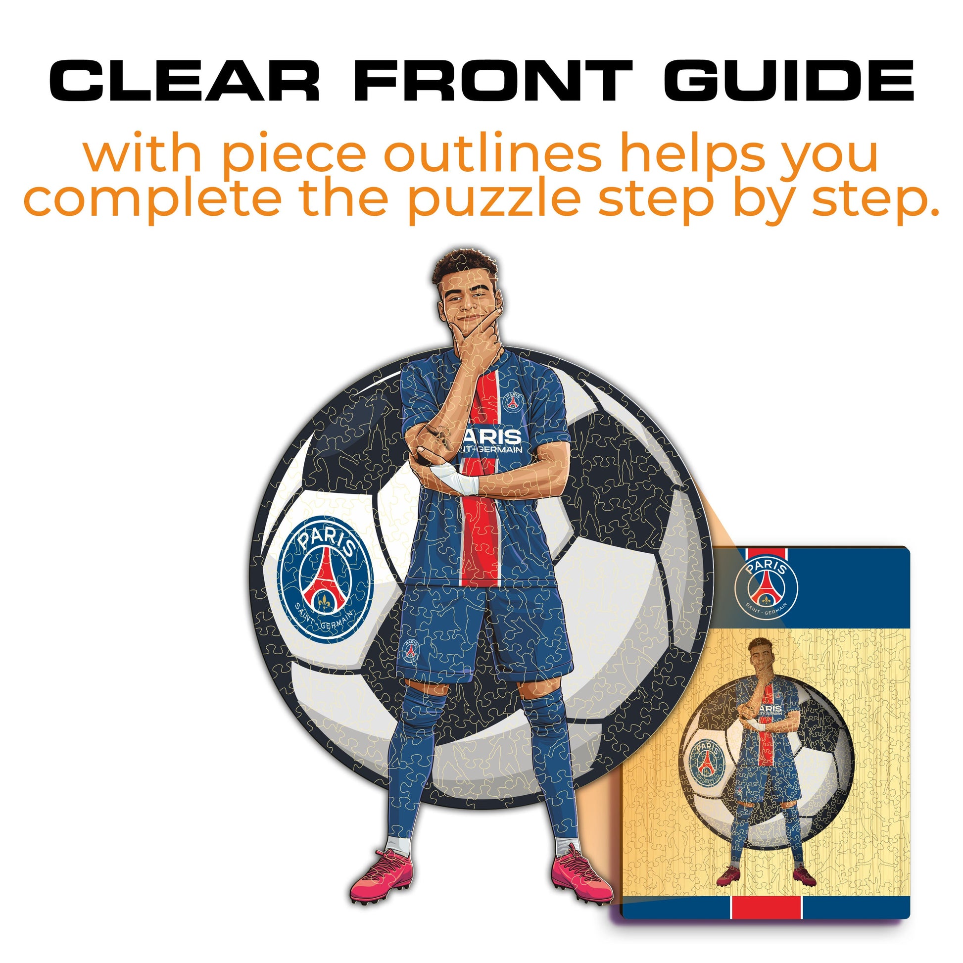 Each puzzle piece has a unique shape that depicts elements related to soccer and iconic player poses.