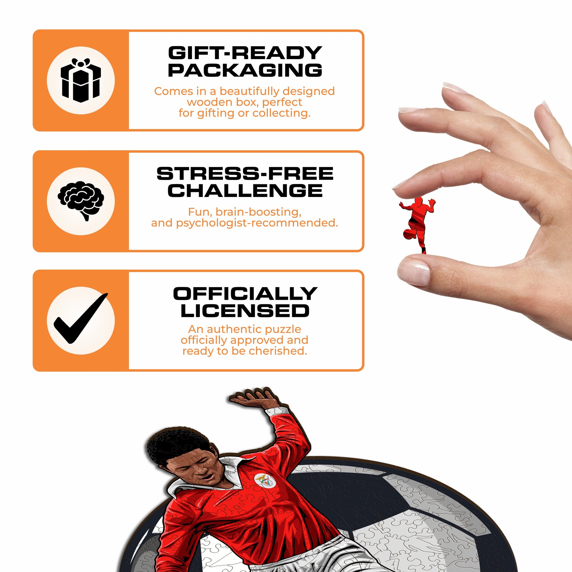 Each puzzle piece has a unique shape that depicts elements related to soccer and iconic player poses.