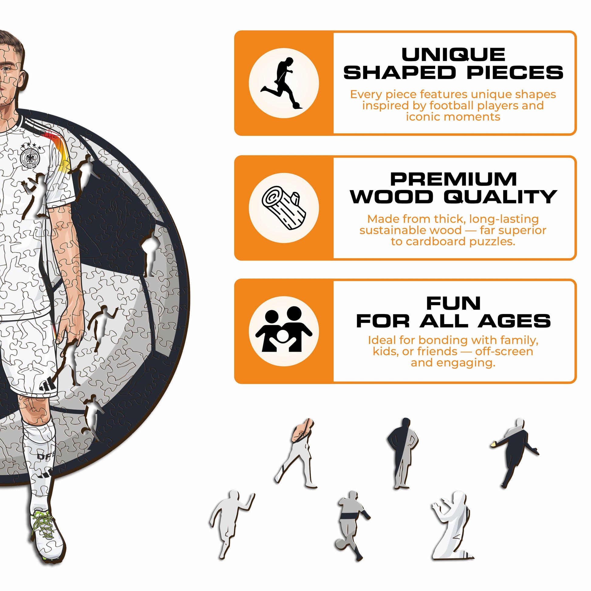 Each puzzle piece has a unique shape that depicts elements related to soccer and iconic player poses.