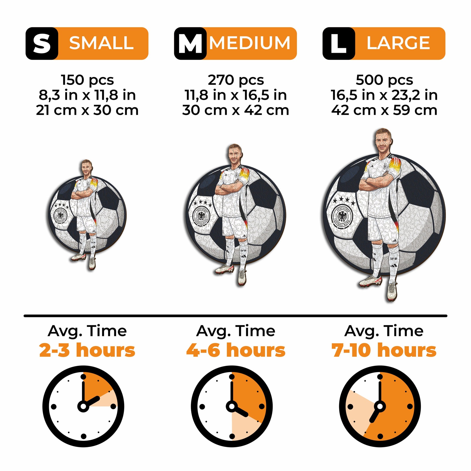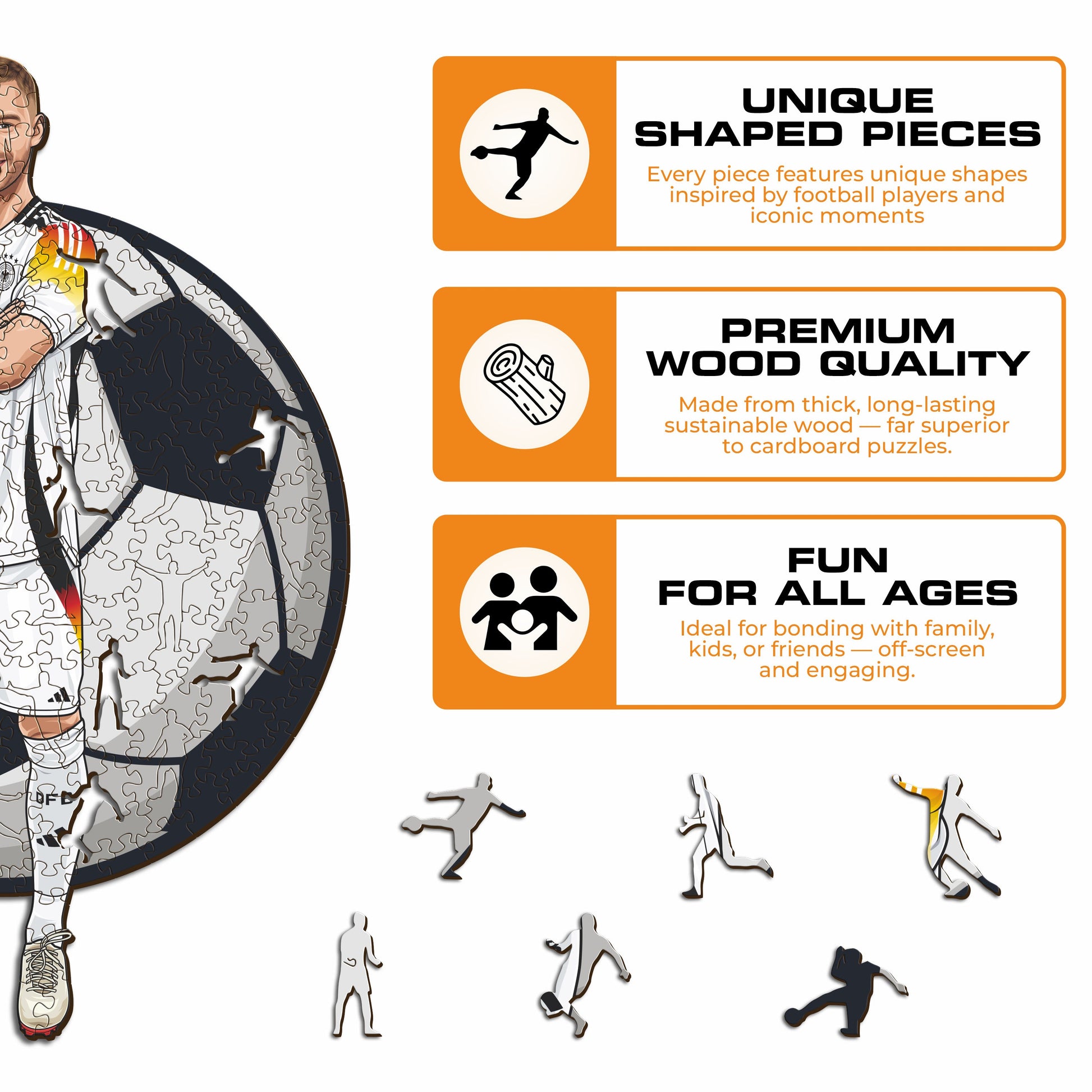 Each puzzle piece has a unique shape that depicts elements related to soccer and iconic player poses.
