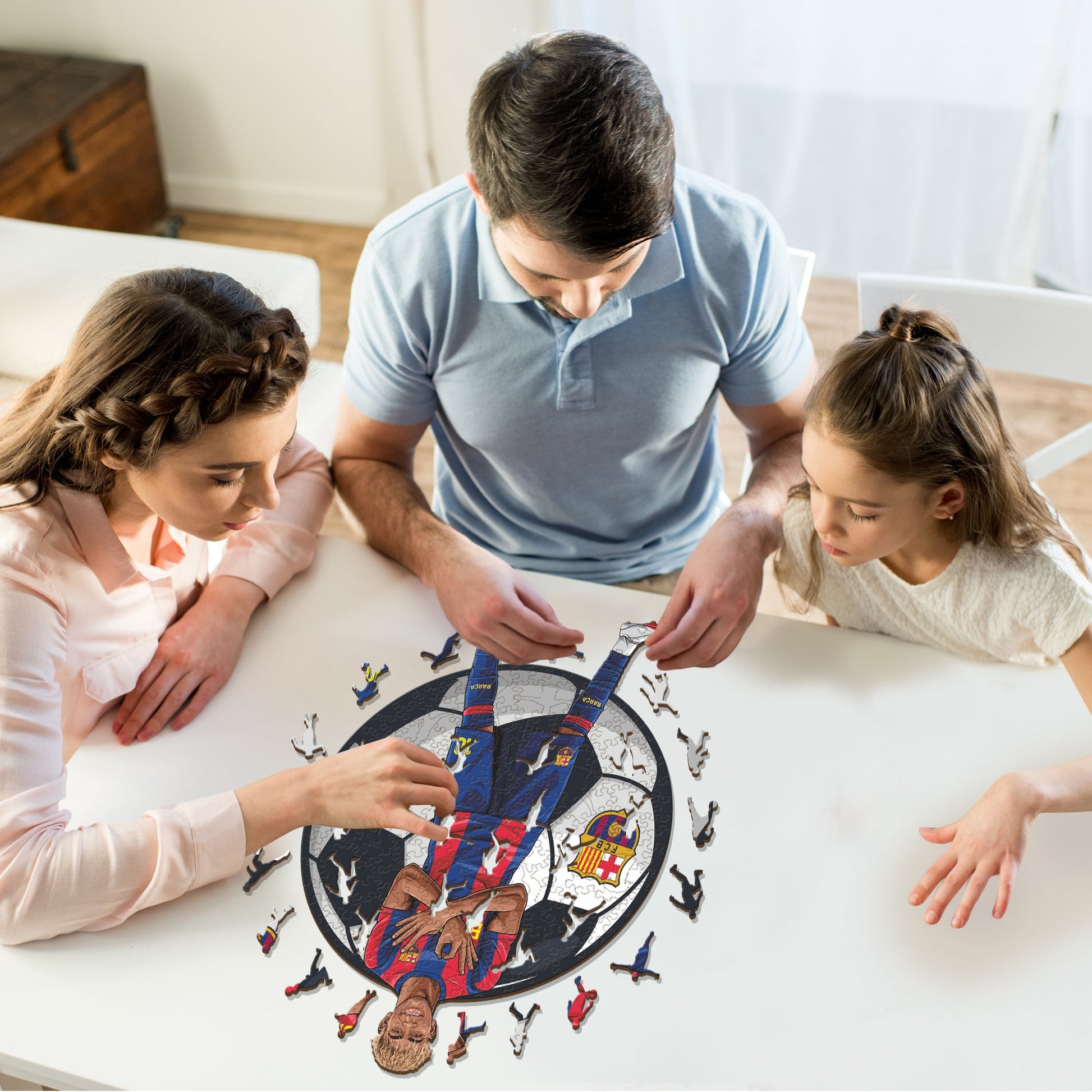Each puzzle piece has a unique shape that depicts elements related to soccer and iconic player poses.